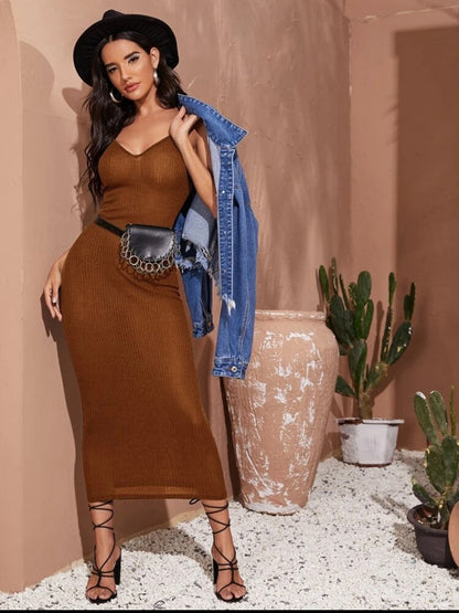 Double V Neck Rib-knit Bodycon Dress without Bag Fits amazing